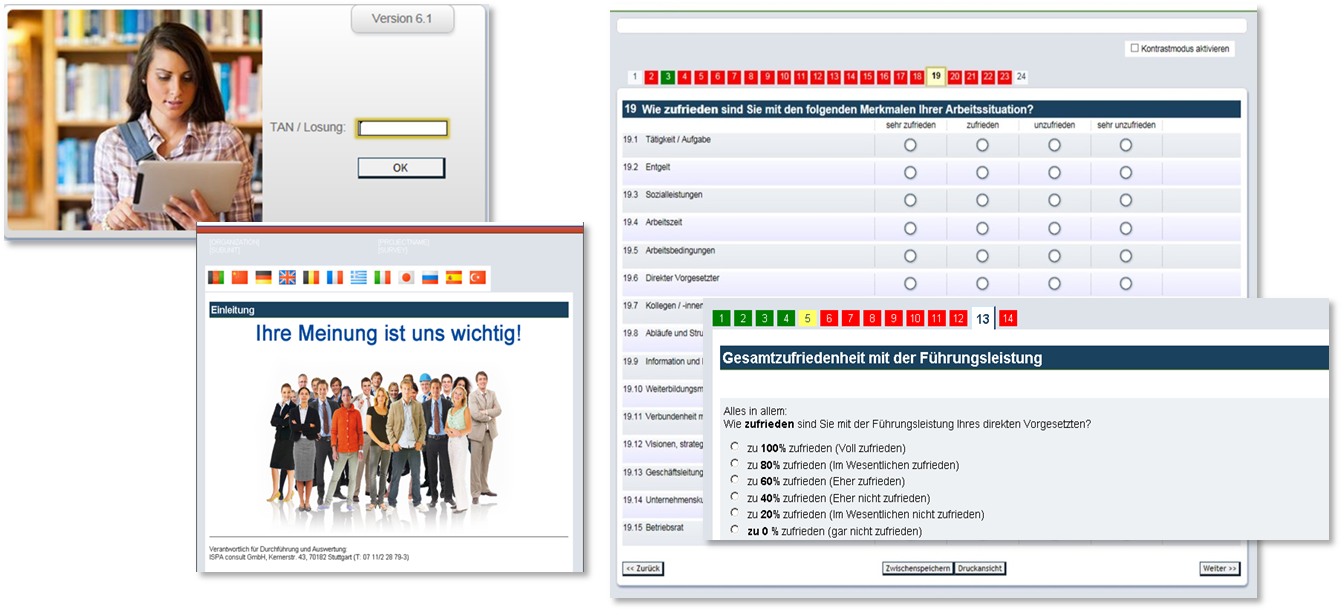 Die ISPA consult GmbH verfügt zudem über ein großes Repertoire an speziellen Fragebogen wie zum Beispiel zur Gefährdungsbeurteilung, für eine Auszubildendenbefragung oder die Mitarbeiterbefragung compact für kleine und mittlere Unternehmen.
